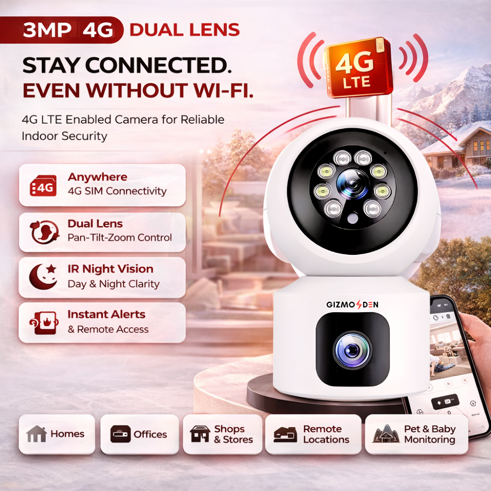 The 3MP 4G Dual Lens Indoor PTZ CCTV Camera is designed for flexible indoor security with enhanced coverage and remote accessibility. Featuring a dual-lens system, it delivers both wide-angle and focused views, ensuring complete monitoring of your space.